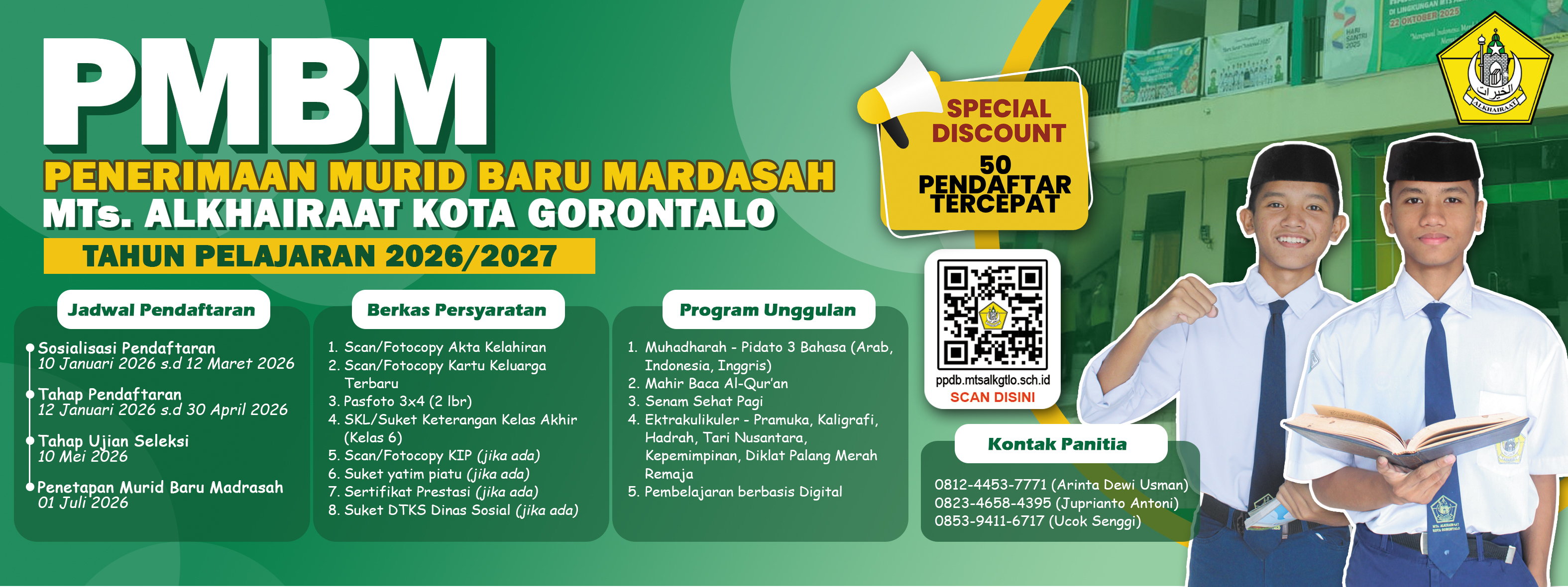 - Setelah pengisian data secara online silahkan datang ke madrasah langsung dengan membawa berkas persyaratan (Kartu KK, Akta kelahiran, Surat Ketrangan dari SD/MI, sertifikat Prestasi jika ada, surat keterangan yatim piatu jika ada, surat keterangan dari DTKS Dinas sosial bagi yang tidak mampu atau suket dari desa/kelurahan,Bukti PKH dari desa / kelurahan yang masih berlaku) .